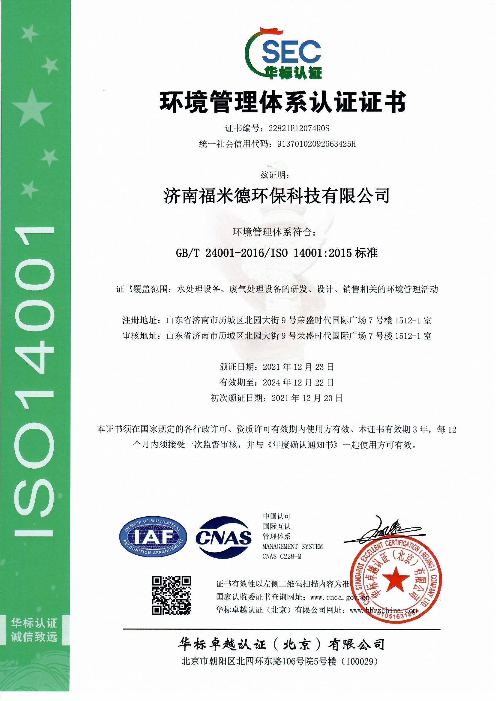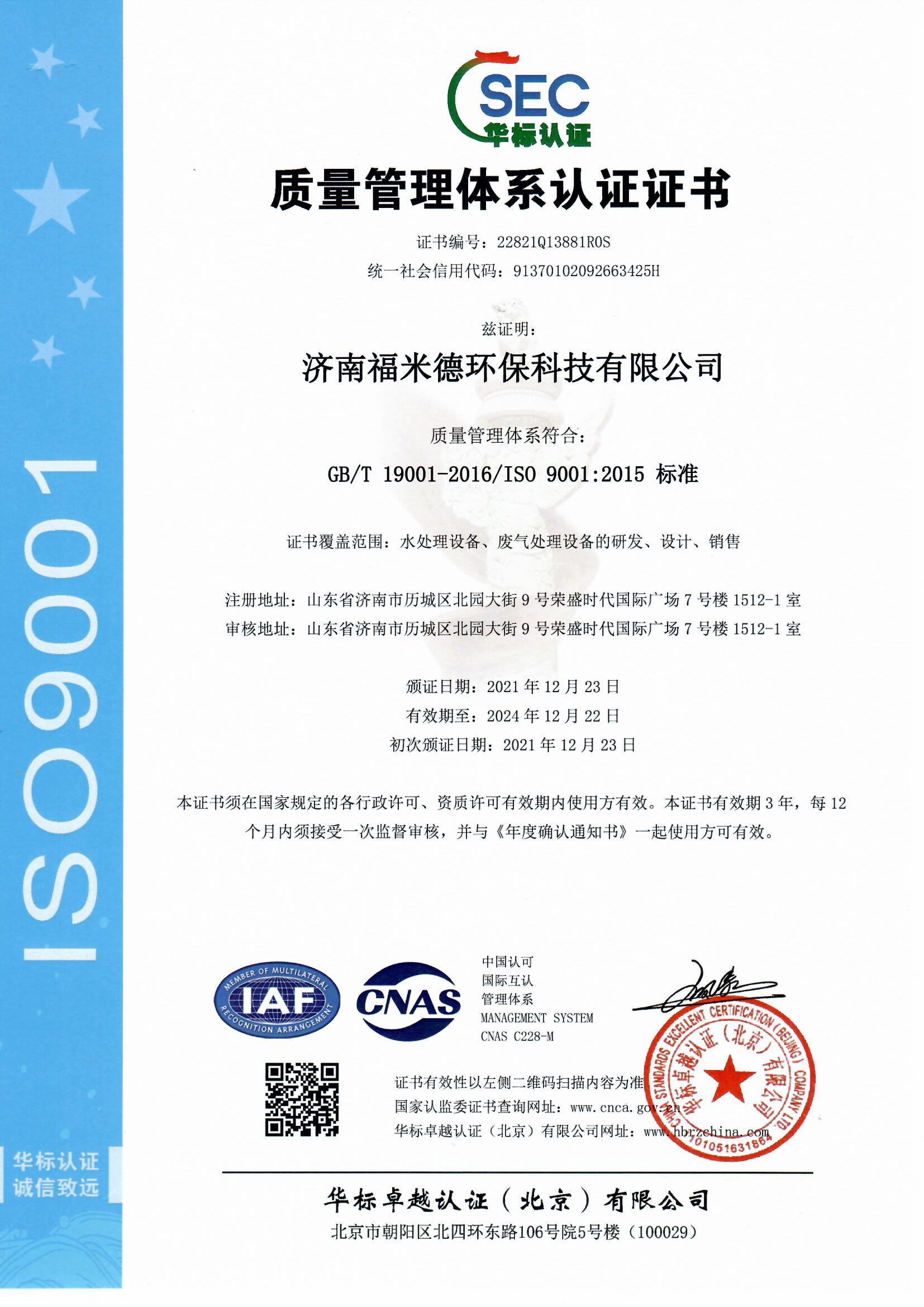 經過我司工作人員和權威認證機構幾個月的努力,我司終于取得三體系(質量管理體系、環境管理體系、職業健康安全管理體系),兩信用(3A級信用企業、重合同守信用企業),中國節能環保等證書。日后,濟南福米德發展將更上一層樓。謝謝新老客戶一直以來對我司的支持與鼓勵。濟南福米德環保科技有限公司主營自清洗過濾器、全程綜合水處理器、紫外線消毒設備、反沖洗過濾器、碟片式過濾器、機械多介質過濾器,全自動鍋爐軟化水等近百個型號的產品。最后!再次恭賀我司通過ISO9001的認證!