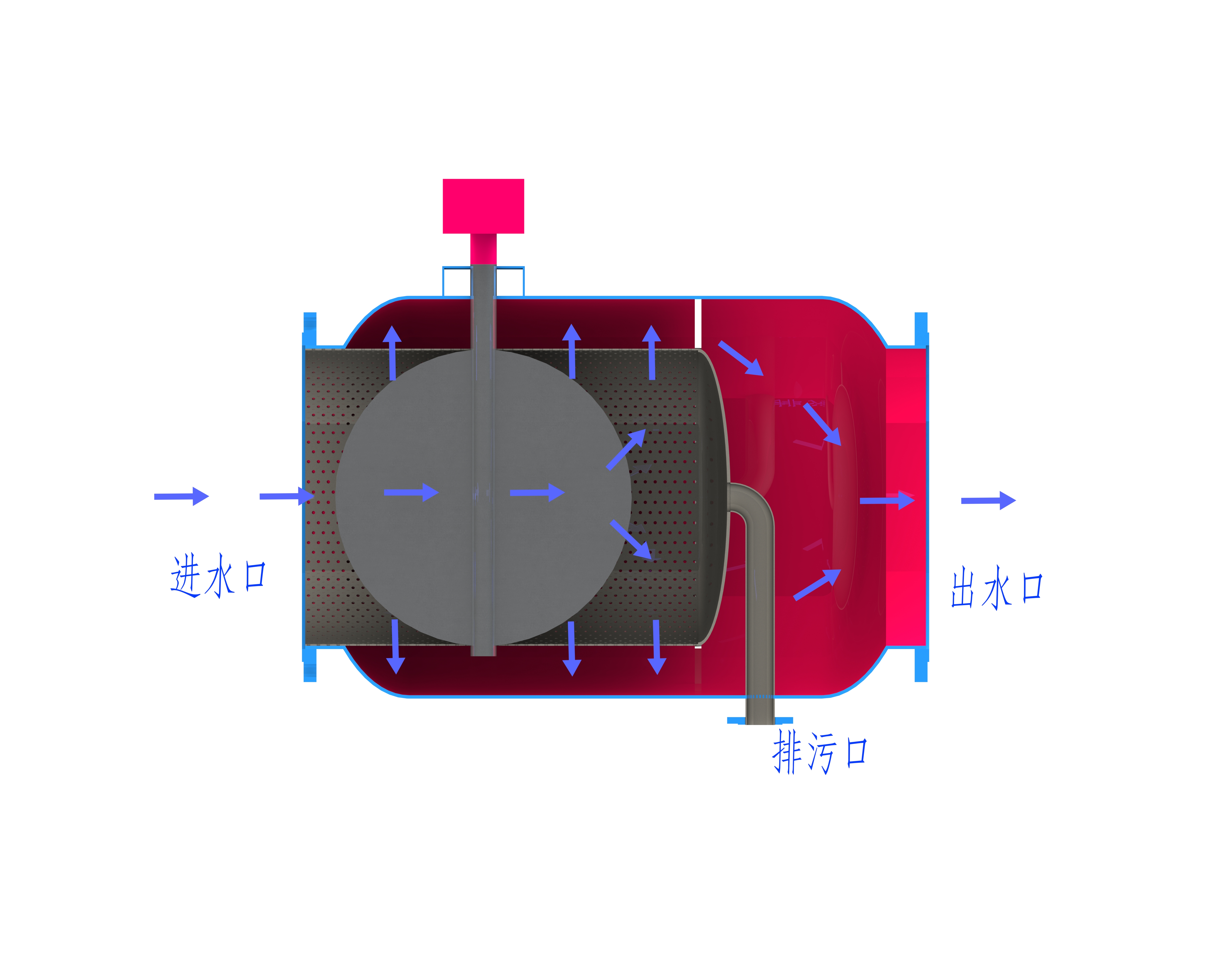 伯努利反洗過濾器主要采購優質碳鋼材質,特殊材質不銹鋼濾網、電動執行器及自動排污裝置組成。當過濾器工作時,電動執行機構引導閥板處于開啟狀態,水流由入口進入過濾器,經過濾網裝置,干凈的水由出水口出。當過濾器處于反沖洗狀態時,關閉導向蝶閥,打開排污電動閥,整個系統可正產運行,無需停機。